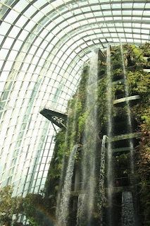 The famous waterfall was constructed at the edge of a 35 metre high "mountain", which was covered in vegetation, ranging from climbers to creepers to flowers to...everything! When we went to the highest point of the "mountain", we could actually stand behind the waterfall! On that day itself, I spotted some window-cleaners doing their job. When I first walked into the Cloud Forest, they were cleaning the lower glass. Now they were ascending higher and higher. They've got quite a unique way of doing it...